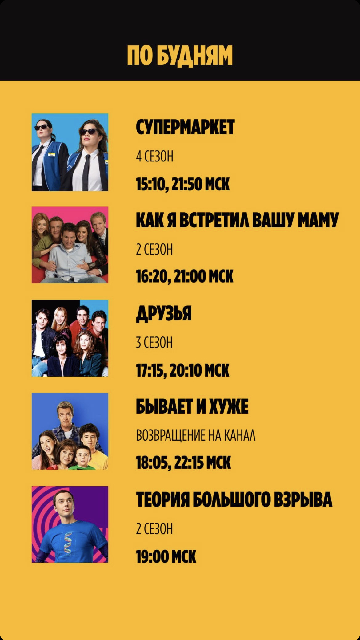 Weekdays: Superstore, How I Met Your Mother, Friends, The Middle, The Big Bang Theory