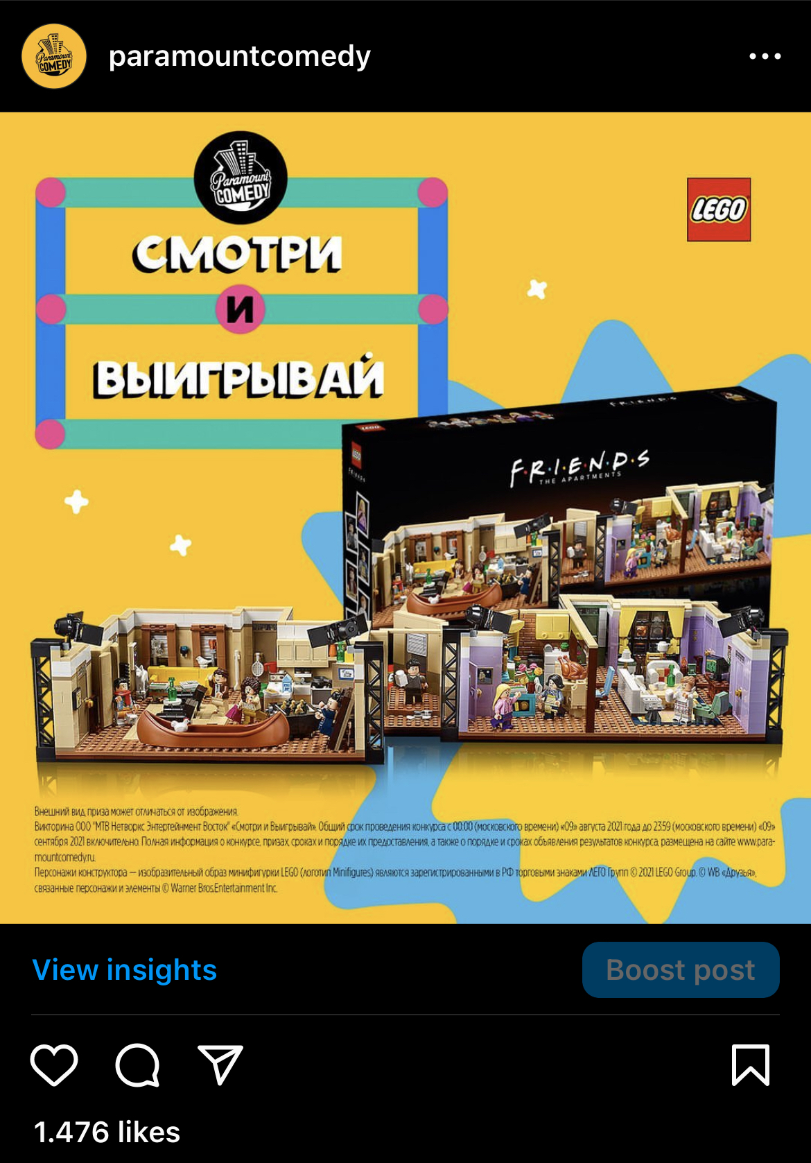 in august 2021, we made a huge collaboration with lego brand and created a contest for our followers with Friends tv series lego kits as a prize